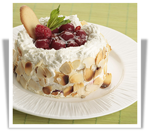 Ha a torta összeállt, az oldalát és a tetejét befedjük a Meggle Cukrászhabbal. Ezután tetszés szerint díszítjük a tortát, használhatunk hozzá meggyet és csokoládéforgácsot.