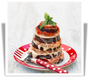 Elkészítés: A kb. 1 centiméter vastagságúra vágott padlizsán- és paradicsom szeleteket megkenjük olajjal, fokhagymával, majd grillezzük. A megsütött szeleteket sóval, borssal ízesítjük. A mozzarellát vékonyra szeljük. Az alábbiak szerint készítjük el a „tornyot”: 1 szelet padlizsánra 1 szelet paradicsom és 1 szelet mozzarella kerül, majd szintén padlizsán, paradicsom, mozzarella. A végén padlizsánszelettel zárjuk a sort. A „tornyot” kissé összenyomva, fogpiszkálóval vagy hústűvel összefogva rakjuk vissza pár percre a grillre, amíg a sajt megolvad. A végén Meggle fűszervajat teszünk a tetejére.